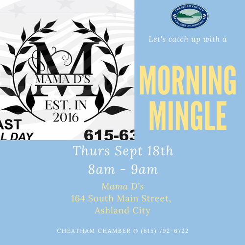 Come join us for a Morning Mingle/CNE (Cheatham Networking Event) at a community favorite - Mama D's. Enjoy good food, laughs and networking all while helping support a local business. There is no better way to start your work day!